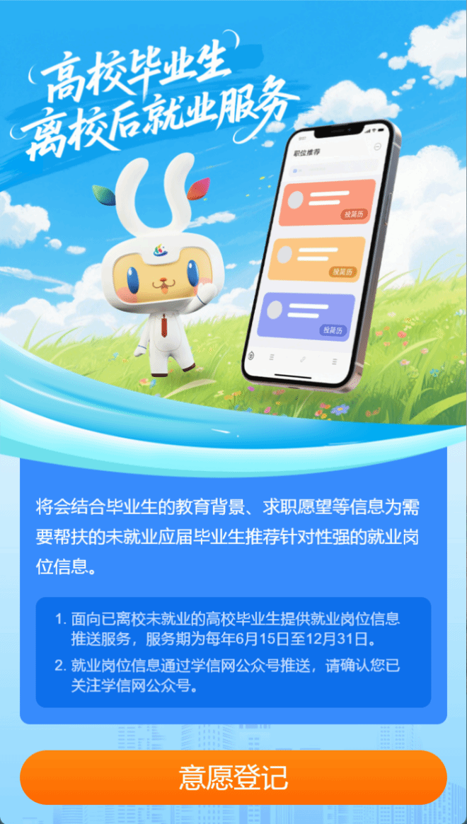近日,教育部上线“高校毕业生离校后就业服务”小程序,针对高校毕业生离校后促就业工作特点,为离校毕业生提供不断线就业服务。一起来看——“高校毕业生离校后就业服务”小程序汇集国家大学生就业服务平台内岗位信息,结合毕业生的教育背景、求职期望等,为离校未就业毕业生持续推荐针对性强的就业岗位信息。高校毕业生打开微信客户端的“发现-小程序”,在搜索框中搜索“高校毕业生离校后就业服务”,即可访问,也可扫描下方小程序码一键直达。“高校毕业生离校后就业服务”小程序上线,是确保离校后就业工作持续有力,促进高校毕业生充分就业的重要举措。未来,“高校毕业生离校后就业服务”小程序将持续不断优化服务功能,整合更多就业资源,为未就业毕业生提供就业岗位、实习见习机会精准推荐对接,助力高校毕业生充分就业。